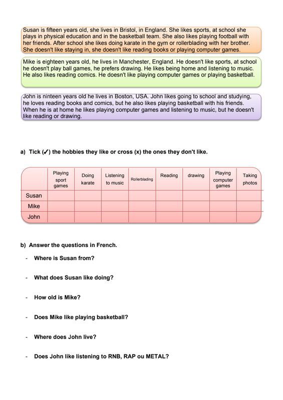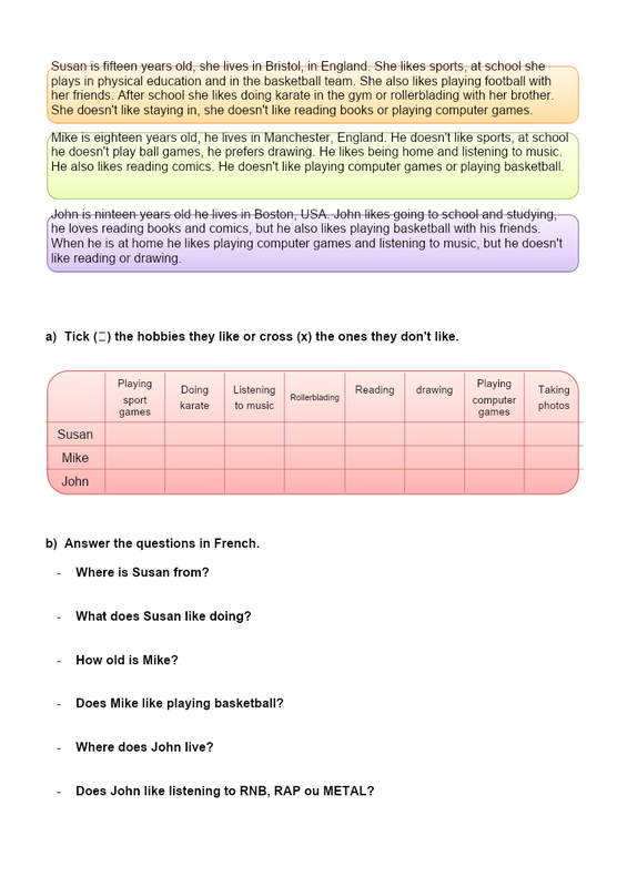 COMME l'exercice de lecture, je vous demande de présenter vos hobbys, ce que vous aimez faire, ou pas ==> 3 choses que vous aimez faire, 3 choses que vous n'aimez pas.