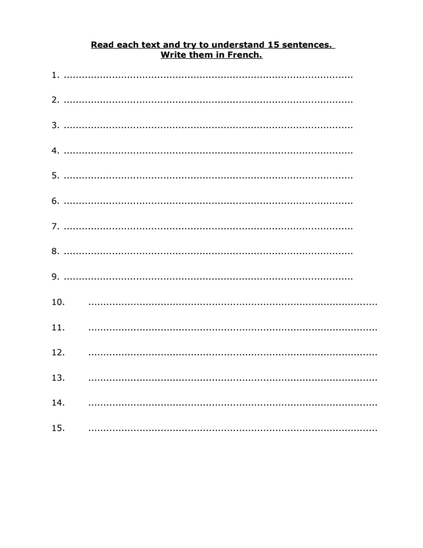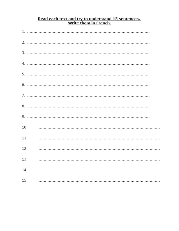 téléchargez les documents à droite de la page. Répondez aux questions en français .Si vous avez un ordinateur, téléchargez le document WORD et répondez sur le document-même. Puis, enregistrez le doc avec vos réponses et renvoyez-le moi. Si vous n'avez pas d'ordinateur, téléchargez le document PDF et répondez sur une feuille à vous. Puis, prenez une photo de vos réponses et envoyez-les moi.